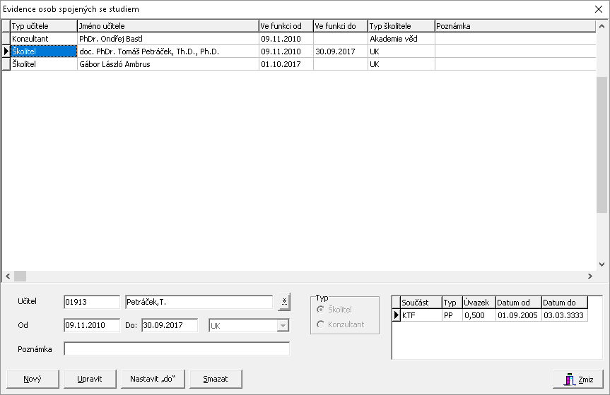 Tento blok informací slouží pro doktorská studia, u kterých se eviduje učitel, školitel nebo konzultant studenta.