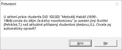 • při uložení záznamu se u doktorandů také kontroluje, zda souhlasí aktuální školitel/konzultant s osobami u disertační práce. V případě nesouladu se nabídne jejich synchronizace. Pokud některý ze záznamů zakládá změnu osoby do budoucna, je vyžádán souhlas se změnou osoby u záznamu disertační práce, které se provede automaticky databázovou procedurou.