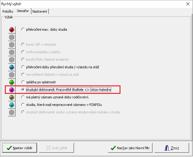 • pro kontrolu shody aktuálního školitele evidovaného u studia a u disertace je možné využít příslušnou položku semaforu.