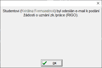 • po úspěšném převodu uchazeče do studia (viz. kapitola Přenos z Uchazeče) se vygenerují e-maily, které odkáží uchazeče riga na založení žádosti o uznání zkoušky / práce. Pro odeslání e-mailu se používá nová e-mailová šablona "Podání žádosti o uznání zk./práce (RIGO)" ("stud_vyzva_uznani_rigo")