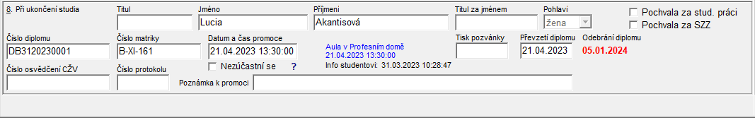 • Datum odebrání diplomu - datum odebrání diplomu je možno jen v celouniverzitní roli. Viz kapitola Odebrání diplomu.