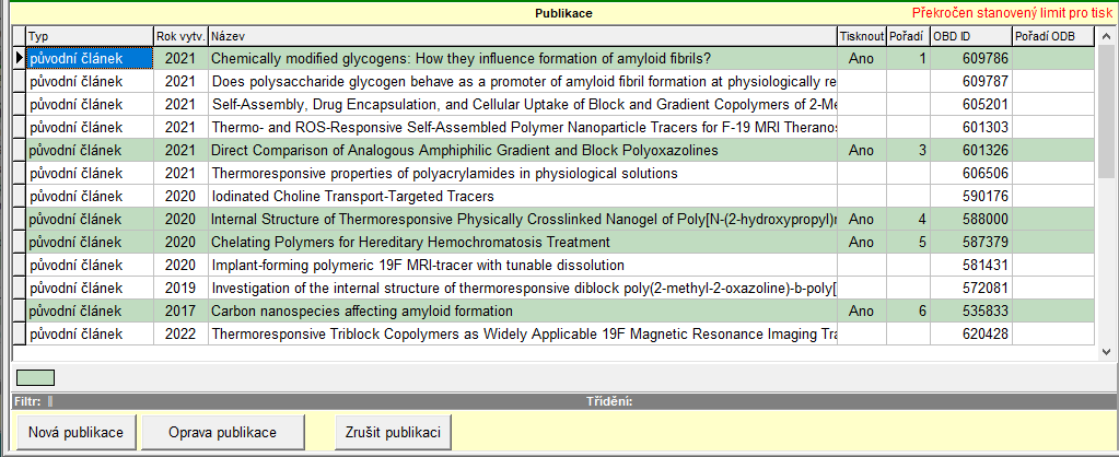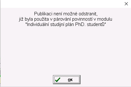 Před smazáním publikace program zkontroluje, zda tato publikace nebyla použita v párování povinností v modulu "Individuální studijní plán PhD. studentů". Pokud ano, oznámí tuto skutečnost a publikaci nedovolí smazat.