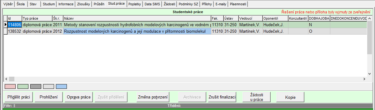 - V případě, že k uvedené práci existuje alespoň jedna žádost o neveřejnost, která není irelevantní nebo zamítnutá zobrazuje se v pravé horní části seznamu stud. prací červený text: "Řešení práce nebo příloha byly vyjmuty ze zveřejnění". (Stejný text se zobrazuje v Detailu práce jako tučný červený text v levé horní části okna.)