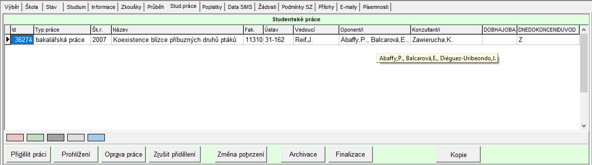 Světle modrou barvou se podbarvuje ta práce, na základě které student absolvoval. Aby nedošlo ke ztrátě informace, zda je již práce finalizována, je sv. modře podbarven pouze název práce, zbytek řádku má barvu dle stávajících pravidel.