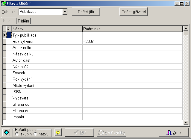 - dále pokračujeme nastavením výběrových a třídících podmínek (více viz Zde)
