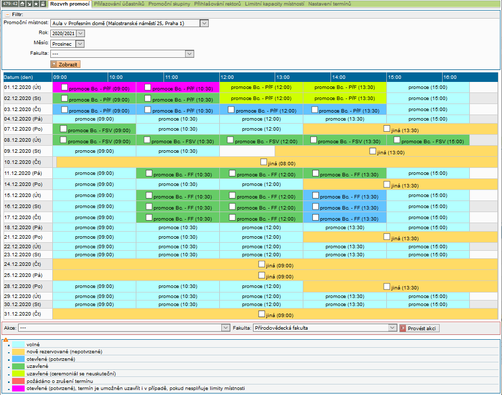 Menu Rozvrh promocí slouží k prohlížení rozvrhu připravených akcí v závislosti na vybraném termínu a promoční místnosti.