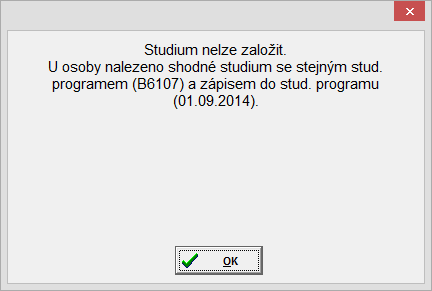 u matričních studií se kontroluje, zda pro danou fakultu, studenta, studijní program a zápis do stud. programu neexistuje duplicitní studium. Pokud kontrola neprojde, zobrazí se hláška a program neumožní takové studium zadat: