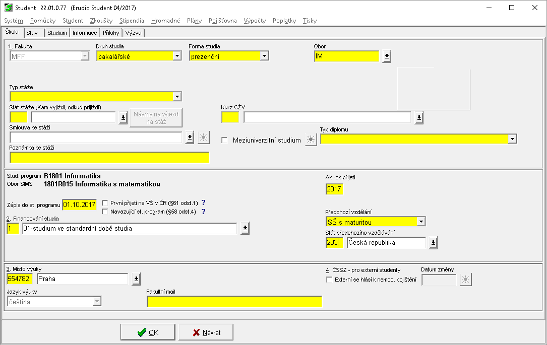 - Záložka "Škola": Typ stáže, Stát stáže, Smlouva ke stáži, Poznámka ke stáži, Kurz CŽV, Meziuniverzitní studium, Typ diplomu, Zápis do st. programu, První přijetí na VŠ v ČR, Navazující st. program, Má nárok na průkaz zdarma, Financování studia, Ak. rok přijetí, Předchozí vzdělání, Stát předchozího vzdělávání, Smlouva k poplatkům za studium, Nepočítat poplatky za studium, Místo výuky, Jazyk výuky, Externí se hlásí k nemoc. pojištění.