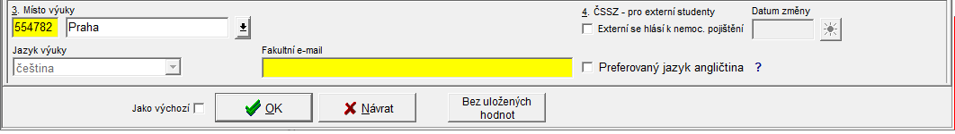 - Nebudou-li uživateli vyhovovat přednastavené hodnoty, může použít tlačítko "Bez uložených hodnot", které je viditelné na liště s tlačítky "OK" a "Návrat", pokud již došlo k uložení hodnot z prvního nového studia. Tlačítko vyprázdní přednastavený formulář a nastaví položky "postaru" - přednastaví jen základní údaje jako doposud.