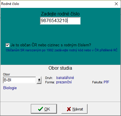 Zobrazí se dialogové okno pro zadání rodného čísla osoby, dále je nutné ještě vybrat také druh, formu a obor zakládaného studia.