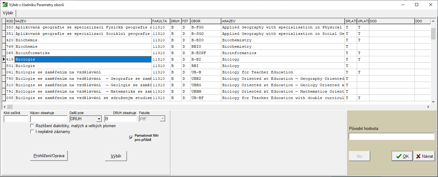 - Tlačítko otevře číselník Parametrů oborů, ve kterém se nabízí všechna povolená studia pro studium.