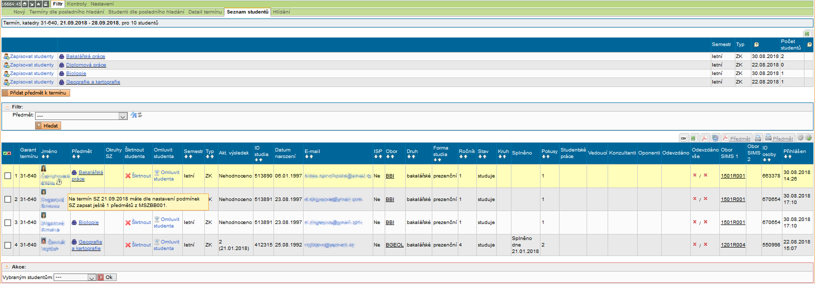 V seznamu studentů naleznete tabulku se studenty přihlášenými na vybraný termín včetně předmětů, na které jsou studenti přihlášeni. Kromě toho pro uživatele s příslušnými právy je zde možnost akcí v závislosti na nastavení modulu a právech uživatele.