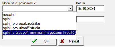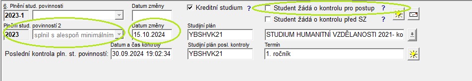- je-li "Příprava pro nový ak. rok" nastavena na "Ne podle splnil", na záložce Studium, na panelu č. 6. se položka "Datum změny" nastaví podle nové položky "Datum".
