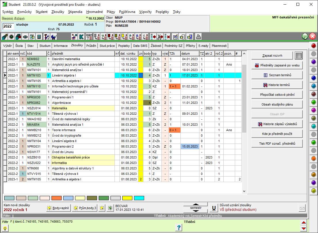 - kód - označení předmětu, max. délka 10 znaků, odpovídá číselníku předmětů. Je-li celá povinnost splněna, toto pole se obarví. (U jednosem. zkoušek totéž jako splněn semestr, u dvousem. zkoušek se obarví řádky obou zkoušek). Při vyplňování výsledků dvousemestrálních povinností se správné obarvení objeví až po obnově dat studenta (volbou Obnova dat; změnou filtru).