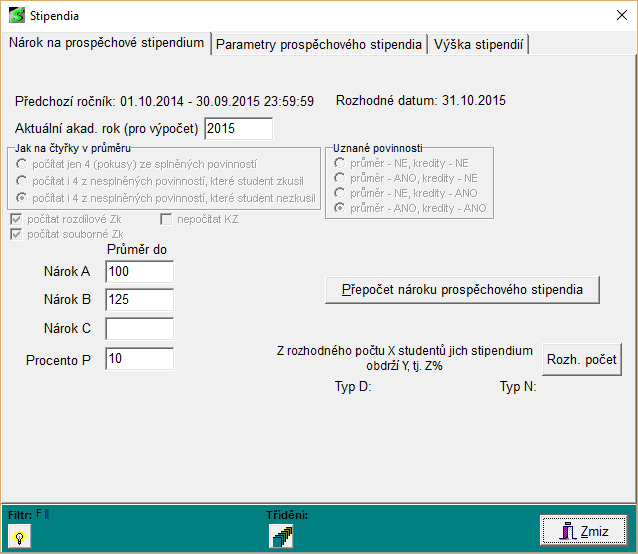 - Aktuální akad. rok (pro výpočet) - akad. rok ve kterém chcete provést výpočet. Pokud má být rozhodné datum 31.10.2015, nastavte 2015. Rozhodné datum se zadává v Parametrech.
