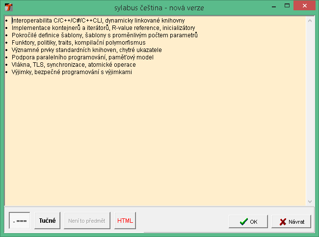- cíl předmětu - očekávané znalosti, vědomosti a schopnosti studenta po absolvování předmětu