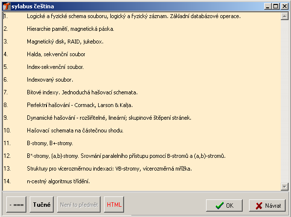 - sylabus - podrobný popis obsahu předmětu, např. včetně rozdělení na jednotlivé lekce a jejich obsah