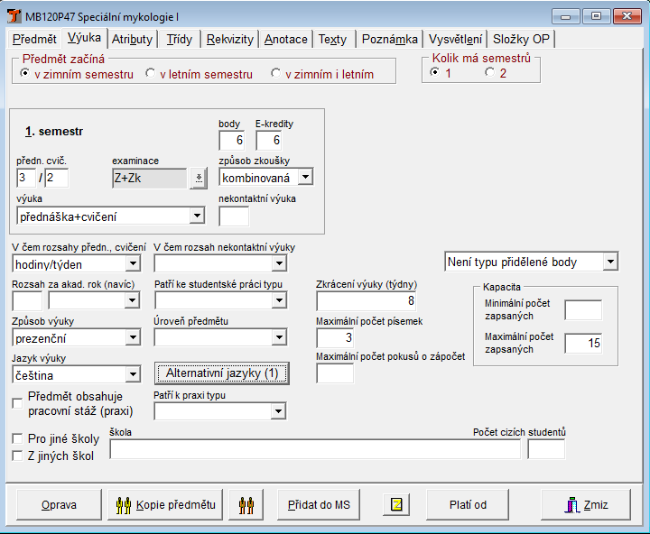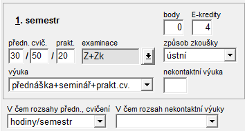 - 1. semestr - popis formy výuky a examinace v 1. semestru. Poznámka 1. semestr může být zimní i letní, záleží na nastavení, kdy předmět začíná