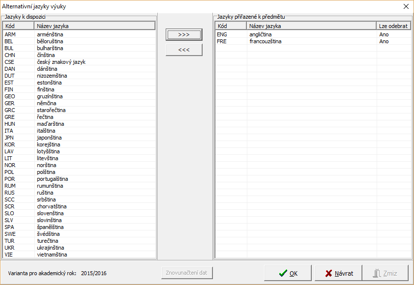 Otevře se okno, ve kterém je možno zvolit jeden či více jazyků výuky. Konkrétní jazyk výuky se nastavuje až u jednotlivých rozvrhových lístků.
