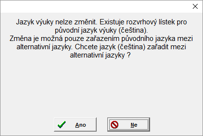 Při změně hlavního jazyka výuky se při ukončení editace tlačítkem "OK" kontroluje: - zda lze původní jazyk změnit. Pokud k původnímu jazyku výuky existuje pro dané období rozvrhový lístek, nelze jazyk výuky změnit. Je zde ale možnost zařadit původní jazyk výuky mezi alternativní jazyky. Tuto skutečnost program oznámí a nabídne zařazení mezi alternativní jazyky. Po odsouhlasení je původní jazyk mezi alternativní jazyky zařazen.