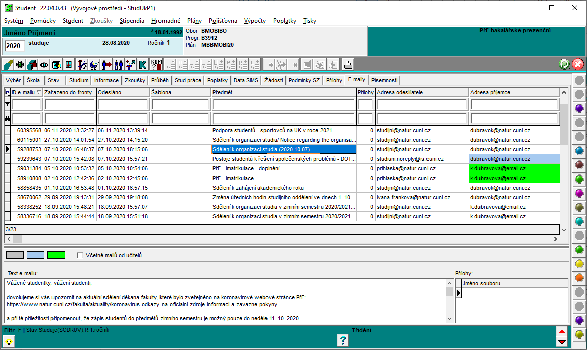 - e-maily odeslané dané osobě, pokud e-mail není vázán na konkrétní studium
