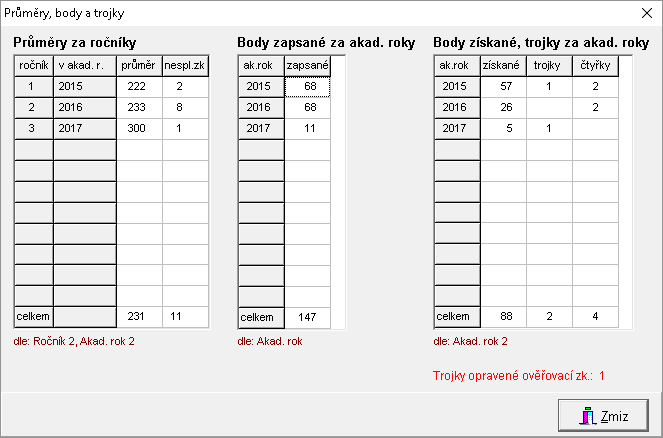 - V tabulce Body získané, trojky za akad. roky se vše počítá dle položky Akad. rok 2.