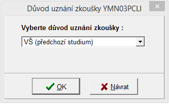 - Po stisku tlačítka, nastavuje-li se zkouška na stav "Uznáno", se zobrazí okénko pro vybrání důvodu uznání zkoušky. Tlačítkem OK se nastavený důvod potvrdí a zkouška se uzná s tímto důvodem. Tlačítko Návrat přeruší uznávání zkoušky.