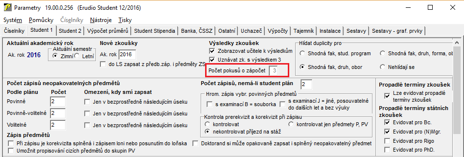 1.) V Parametrech, záložce STUDENT 1 je fakultní konfigurační parametr Počet pokusů o zápočet (params.papocetzapocet).