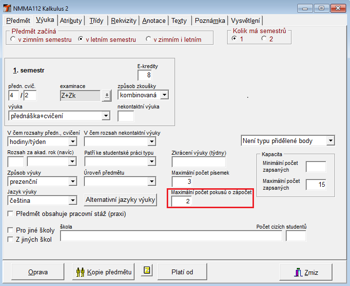 - pokud by bylo třeba u předmětu změnit nastavení počtu zápočtů směrem dolů, měl by se vytvořit nový záměnný předmět od dalšího roku a tento ukončit