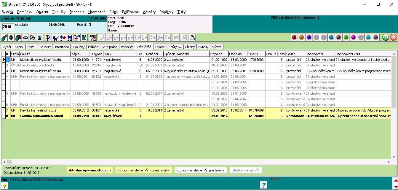 Na této záložce se zobrazují data stažená ze SIMSu //sims.msmt.cz, kde je vedena evidence všech studentů na VŠ v ČR.