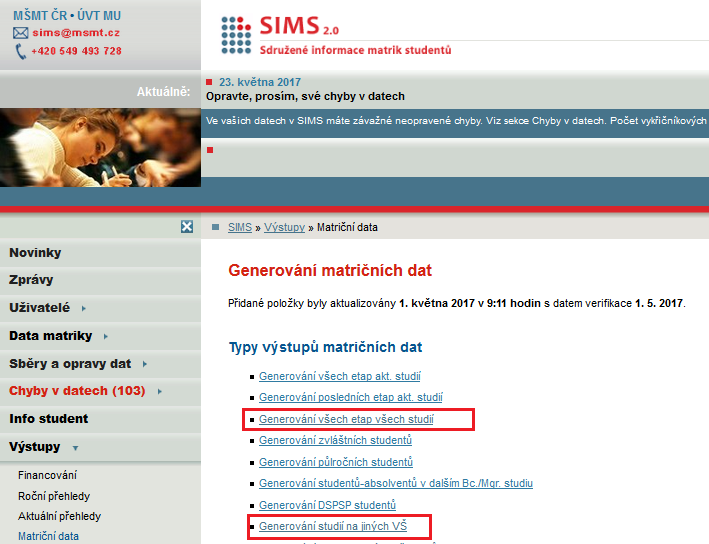 1. Ze SIMS (//sims.msmt.cz) se stáhnou soubory (Výstupy/Matriční data)
