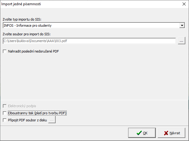 - při zatržení Nahradit poslední nedoručené PDF pokud již student bude mít písemnost v SISu, ale ještě nebude odeslána, pozvánka se přepíše