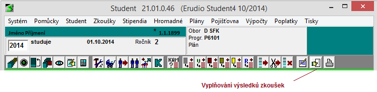 - volbou Zkoušky - Vyplňovat výsledky zkoušek nebo ikonkou Vyplňování výsledků zkoušek se otevře okno Výsledky zkoušek s pokusy. Zde se vyplňují výsledky studijních povinností.