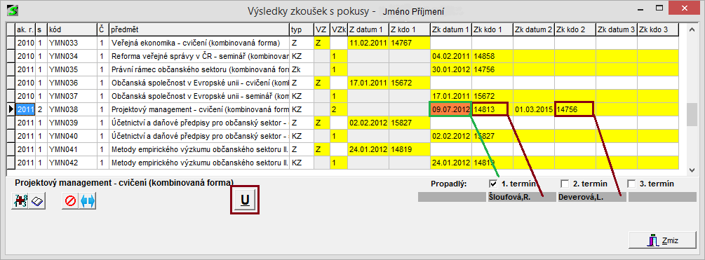 Při vyplňování výsledků zkoušek se barevně zvýrazní sloupce pro vyplnění výsledku, data atestace a učitele. Každá položka je uvedena zvlášť pro klasifikované atestace (Zk) a zápočty (Z).