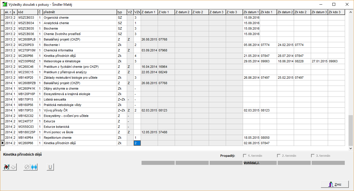 2. Datum: Z datum 1 / Zk datum 1 (datum se uvádí zvlášť pro každý pokus, u ZK jsou vždy maximálně tři pokusy, počet pokusů pro zápočet se odvíjí od nastavení v aplikaci Parametry - parametr Počet pokusů pro zápočet).