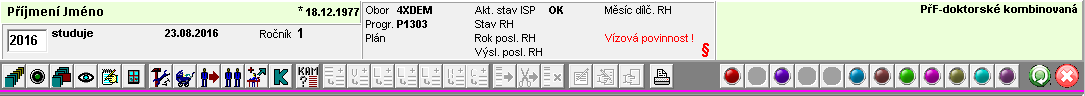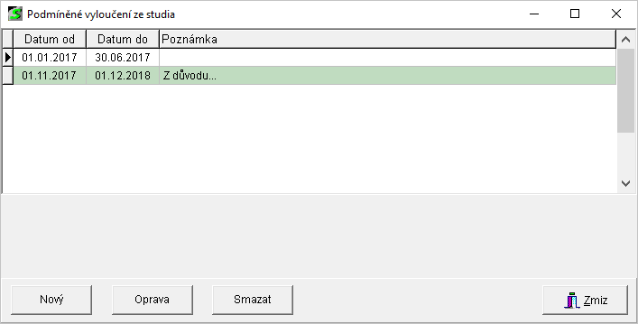 Na záložce "Stav" je nové tlačítko-sluníčko "Podmíněné vyloučení". Po jeho stisku se otevře okno pro evidenci lhůt podmíněného vyloučení ze studia.