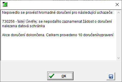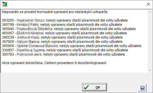 Na konci vypravení se zobrazí report s informací, že se u studenta nepovedlo zaznamenat žádost o vypravení dokumentu z důvodu existence DS.