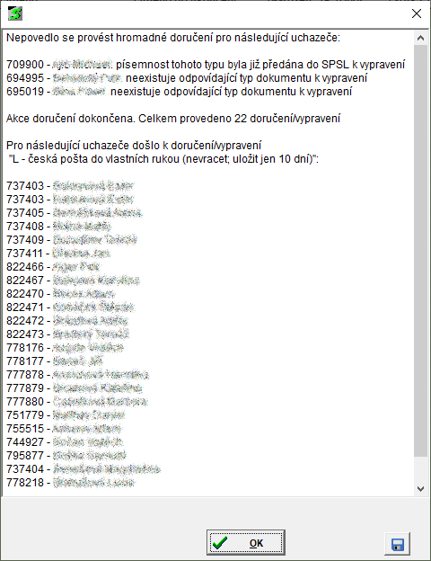 Úspěšné ukončení akce program oznámí, pro kontrolu se zobrazí seznam odeslaných písemností, seznam studentů s již předanou písemností do SpSl či uchazečů, kteří uvedený typ písemností nemají