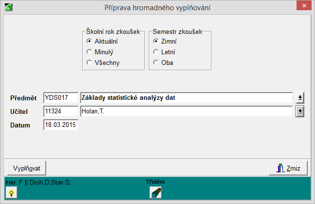 - Volbou tlačítka Vyplňovat se vyvolá okno s vyfiltrovanými zkouškami ze zadaného předmětu: