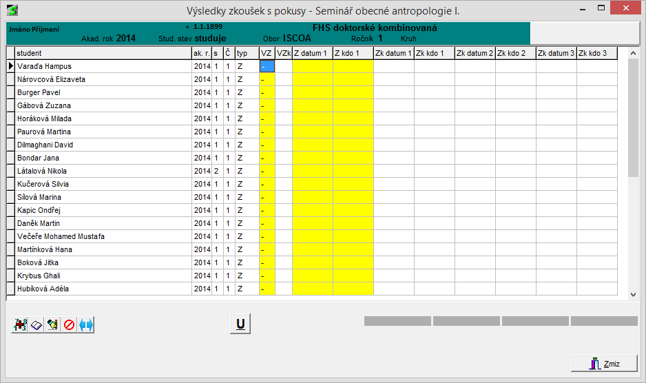 - v okně jsou zobrazeny zkoušky z daného předmětu u vybraných studentů