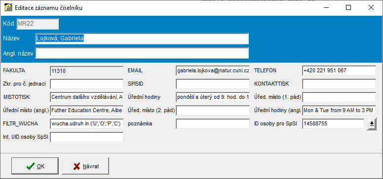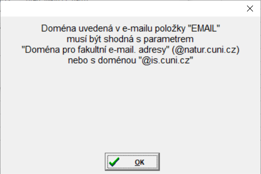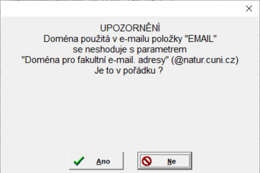 - Pouze pro UK: Pokud e-mailová adresa neobsahuje fakultní parametr "Doména pro fakultní e-mail. adresy", ale alternativní doménu "cuni.cz", program na to upozorní. Pokud uživatel odsouhlasí, že je to v pořádku, záznam se uloží.