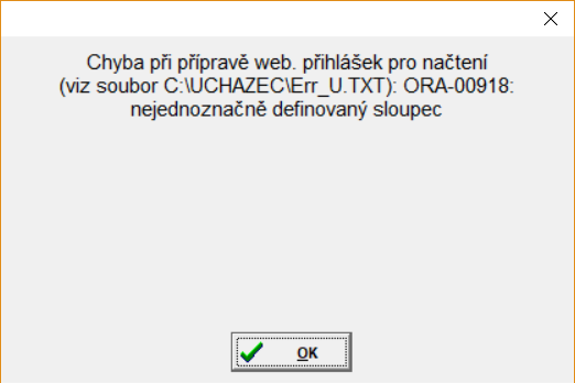 V tomto případe je při otevření okna pro hrom. import položka "jen moje (ref:)" nezaškrtnutá. - Dojde-li při práci s filtrem "FILTR_WUCHA" v Uchazeči k chybě, chybný dotaz se standardně uloží do chybového souboru Err_U.txt. Administrátor (nebo osoba, která zadává FILTR_WUCHA do číselníku REFERENT) má tak možnost si dotaz doladit. Asi nejčastěji může docházet k chybám typu "nejednoznačně definovaný sloupec", protože se data vybírají z více tabulek, kde některé položky mají shodné názvy.