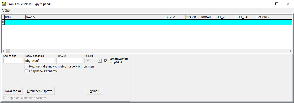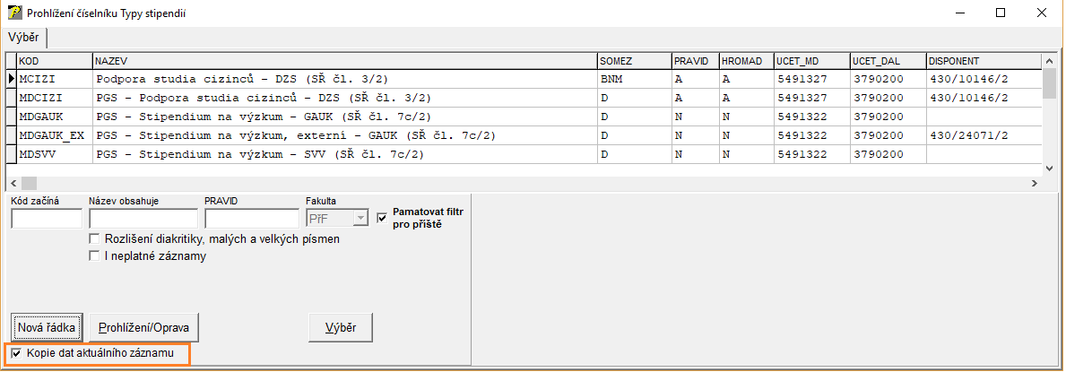 V tuto chvíli je zaškrtávátko "Kopie dat aktuálního záznamu" možno využít u číselníku "Typy stipendií". V případě potřeby přidání u dalšího číselníku se obraťte na firmu Erudio.