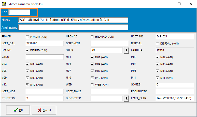 Kromě pole "Kód", které je bez hodnoty.