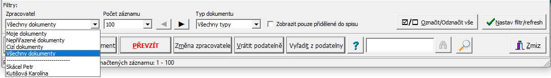 - volba "Filtrovat zpracovatele" je přístupna pouze uživateli s právem vedoucího nebo správce. Referent má přístupné jen "své" dokumenty, u kterých je nastaven jako zpracovatel.