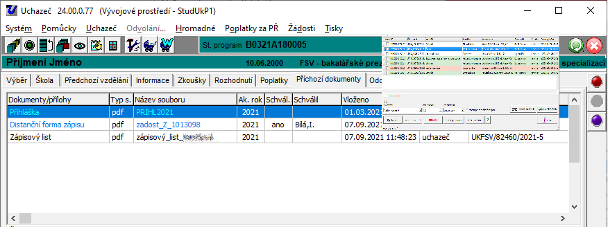 - Typ dokumentů - v současné době lze z podatelny ke zpracování převzít tyto typy dokumentů: přihláška, příloha, žádost, odvolání, odvolání UPZ (upuštění od přijímací zkoušky) a odvolání OPR (ostatní prvoinstanční rozhodnutí)