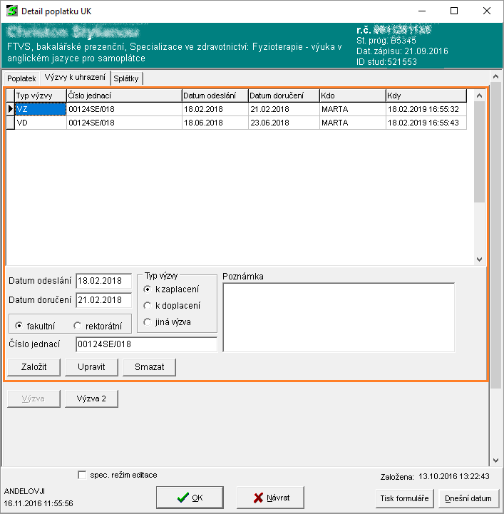 Student - Poplatky za studium » Práce s modulem poplatky » Přehled poplatků » Detail poplatku » Záložka Výzvy k uhrazení