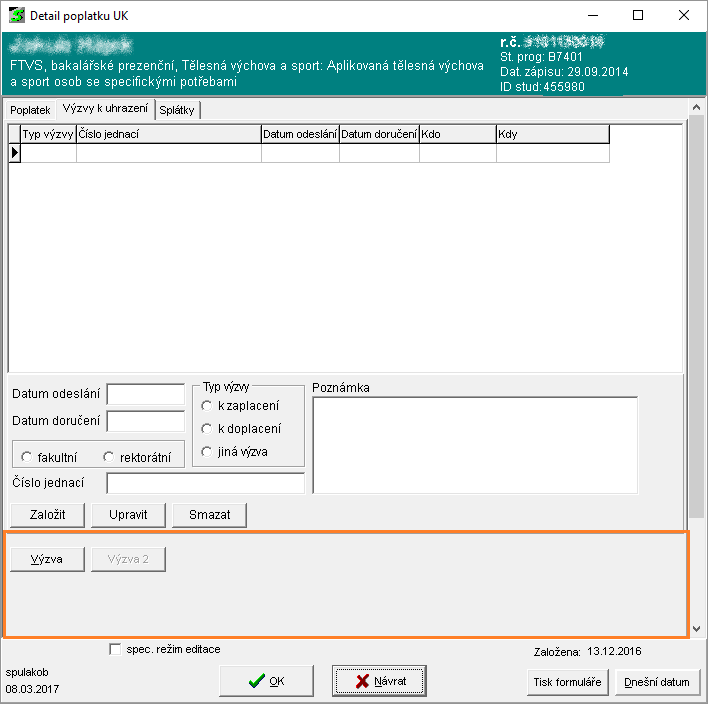 Tlačítko "Výzva" je přístupné u poplatku za studium vyučované v českém jazyce, standardně se tiskne/generuje v českém jazyce.