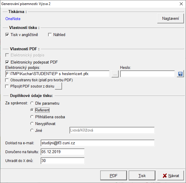 Po kliknutí na tlačítko se otevře okno "Generování písemnosti", kde je třeba vyplnit doplňující údaje pro tisk, zvolit tiskárnu pro tisk, v případě generování PDF souboru je možno přidat elektronický podpis.