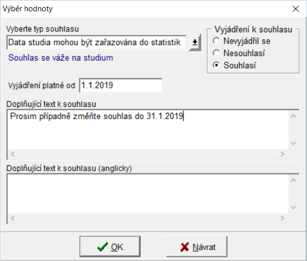 - při volbě Souhlasí/Nesouhlasí se nabídne okénko pri zadání data, odkdy je vyjádření platné